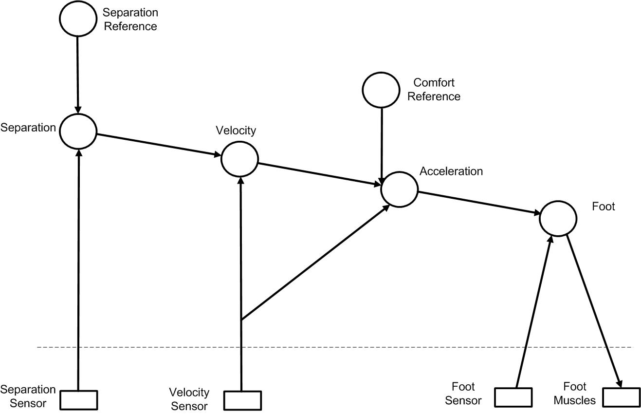 RY: Attached is my draft of the PCT model of this cruise controller. There are two main goals, the separation to the car in front and the “comfort” of driving. The velocity is a function of the separation error, the acceleration is function of the velocity error and the comfort reference and the foot angle is a function of the acceleration error.