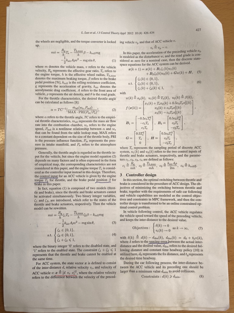 RY: It describes an MPC approach to a car cruise control system. But rather than just controlling velocity it also controls the distance to preceding cars and driving “comfort” (which is related to acceleration). They have some very convoluted maths (I can’t say I followed it all) which results in a set of equations which determines the “commands” for throttle and brake. The equations are attached and include, and require, parameters such as vehicle mass, gear ratio, engine torque, wheel radius and gravity (none of which would be available to a human cruise controller, or necessary for a PCT model).